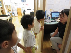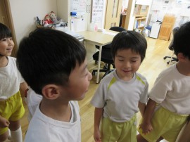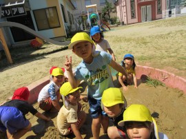そこで、さくら組さんは園長先生に「もう1日泥んこ遊びをしたいです!」とお願いに行くことにしました。 |