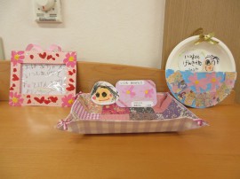 たんぽぽ組さんは小物入れ(トレー)ゆり組さんはハガキ挿し、さくら組さんは写真入れです🎵 |