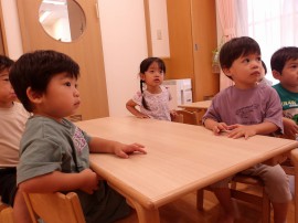 今日も熱い1日になり、残念ながら外遊びはできませんでしたが、すみれ・すずらん組さんはバルコニーに出て外の空気を感じました🎵