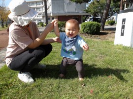 芝生の上で立っち!気持ちいいね(*^^*) |
