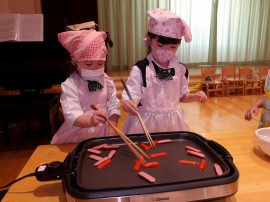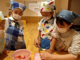 年中組さんはサラダに乗せるウインナーの飾り切りに挑戦です! |