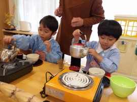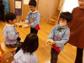 いつも茶道をしているお部屋が工事中の為、今はさくら組の保育室で行っています。