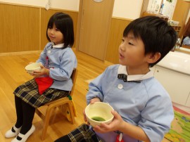 正座の時は足が痛くなった~という子もいるので子ども達はこの立礼式の方が好きなようです😅 |