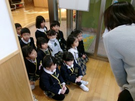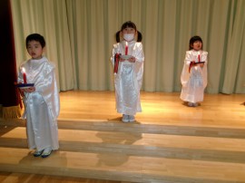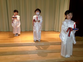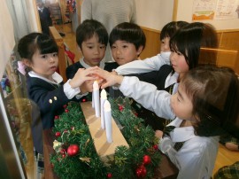 ゆりぐみさんの光の式。ろうそくに初めて火を灯した時は子ども達も先生達もドキドキしましたが、今ではとっても凛々しく素敵な姿を見せてくれています。 |