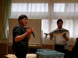 続いて、七尾魚商業協同組合の中田さんが、地元七尾のお魚の話や解体ショーをしてくださいました! |