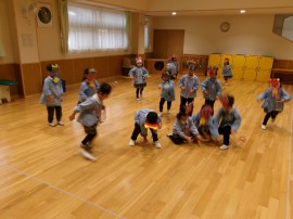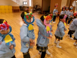 以上児さんもそれぞれの手作りお面をつけてホールに集合です!