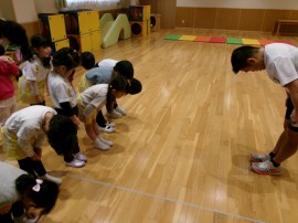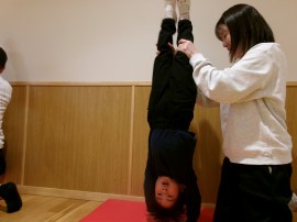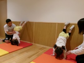 最後は壁を見て立ち、床に手をついて倒立に挑戦しました! |