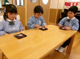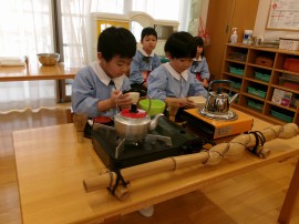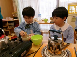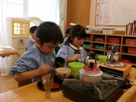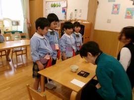 お母さんにお茶を点てるのはちょっとドキドキするな~という子もいましたが、いつも通り慣れた手つきでお茶を入れ、落ち着いた姿が見られました。 |